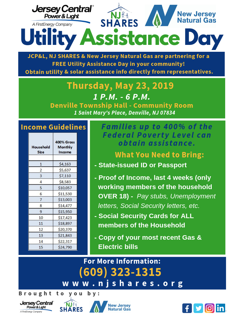 JCP&L – in partnership with NJ SHARES and NJ Natural Gas – is holding an Energy Assistance Day in Morris County on Day on Thursday May 23, 2019.